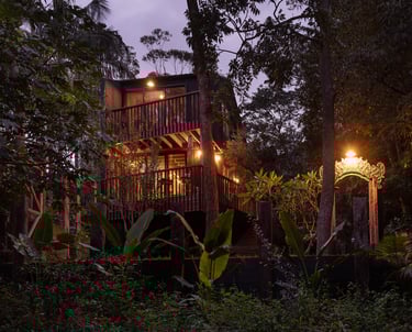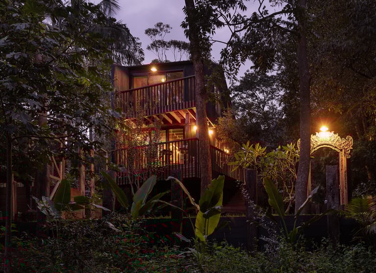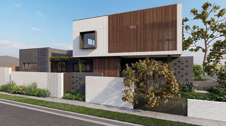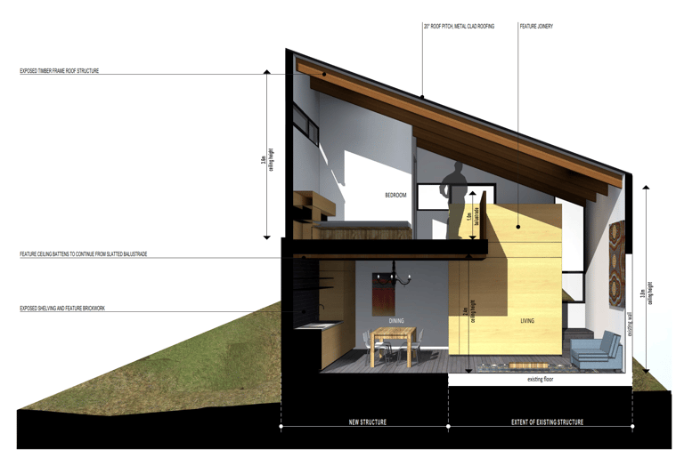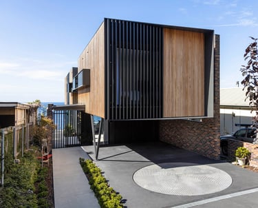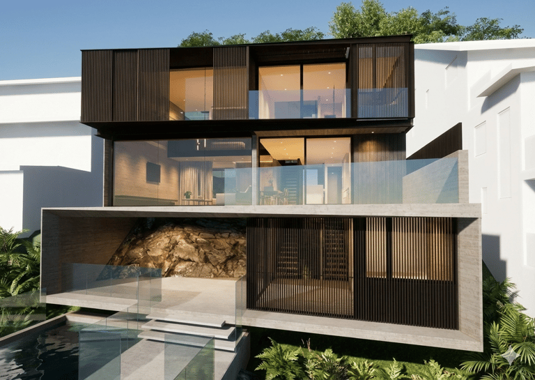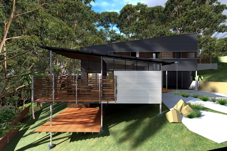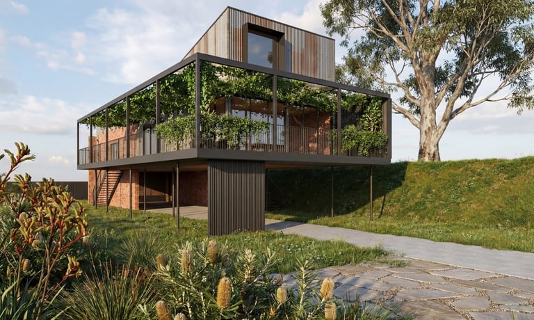 Custom hillside home balancing structure and simplicity, using natural stone and timber to blend with the landscape, ensuring buildability and council approval.