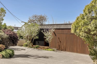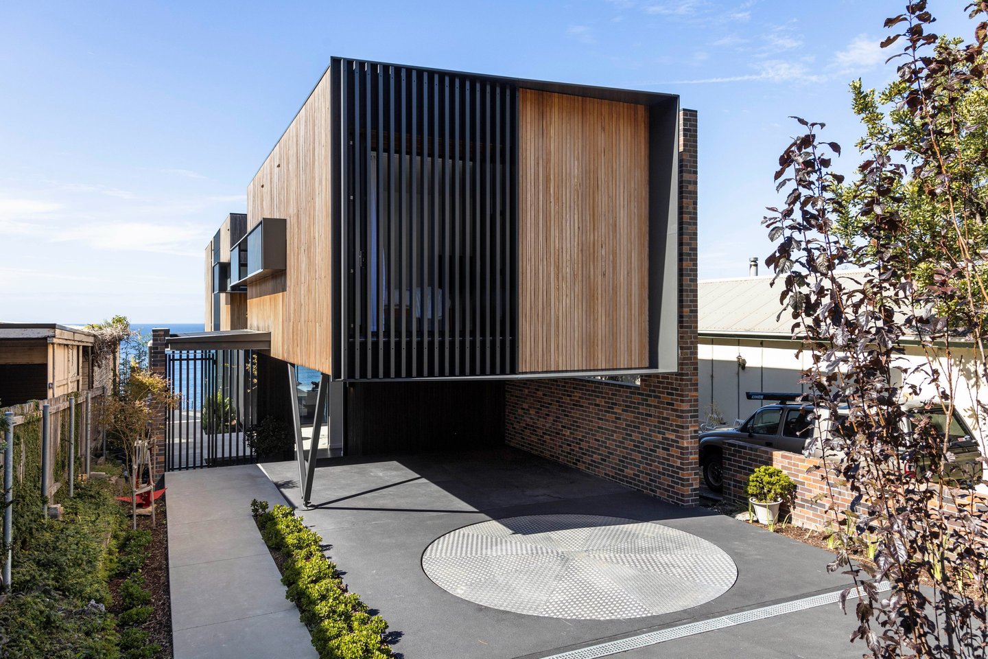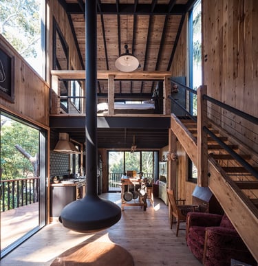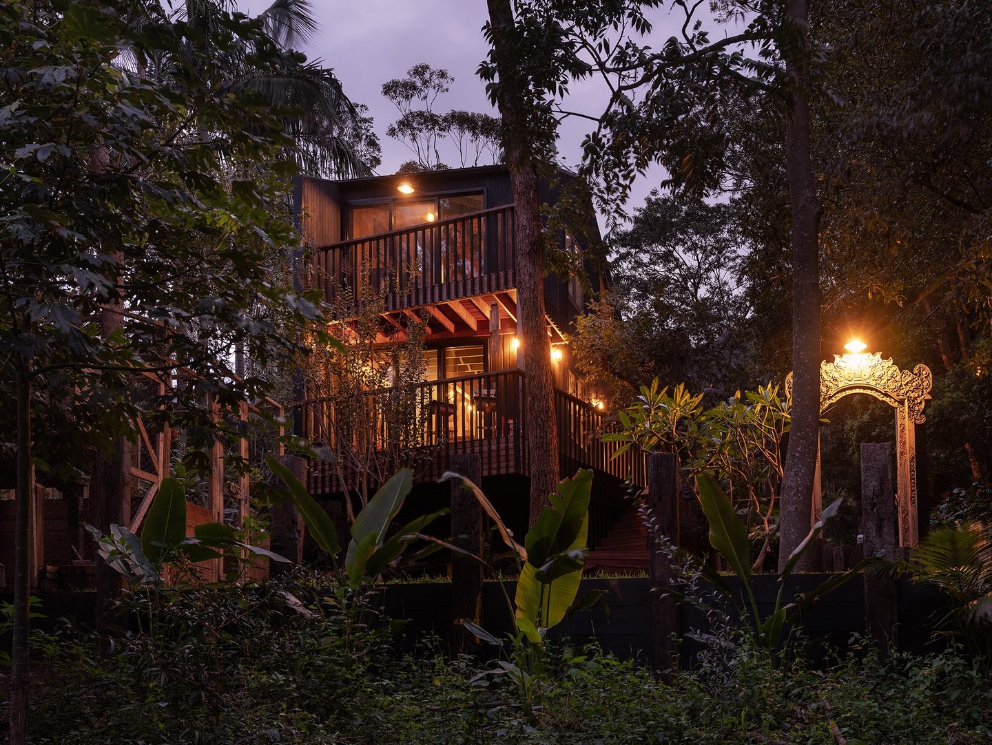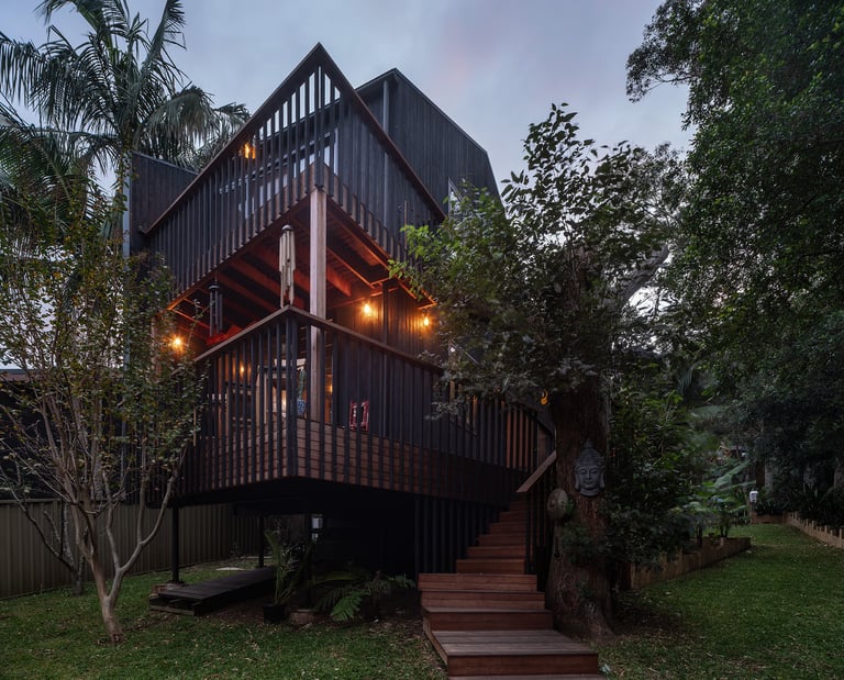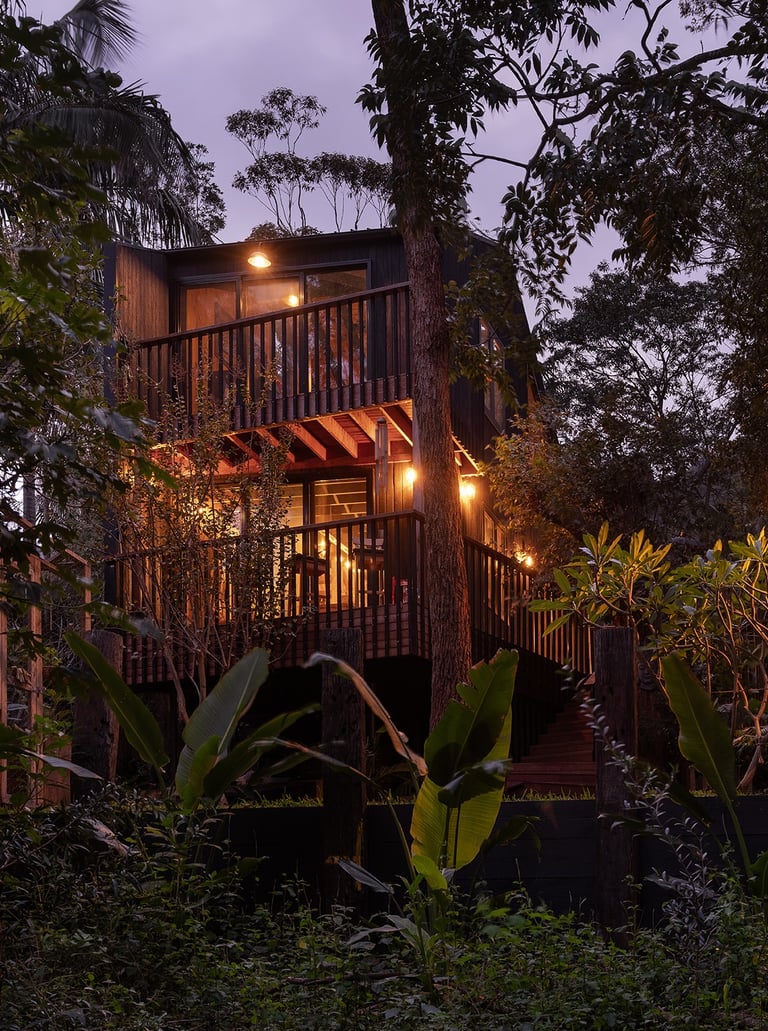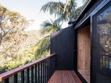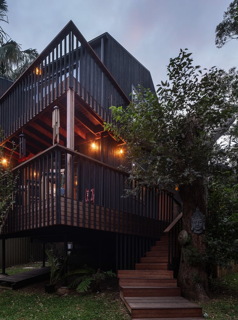 Timber framed structure, on piers, to best accommodate a sloping topography. 'Shou Sugi Ban' charred timber cladding.